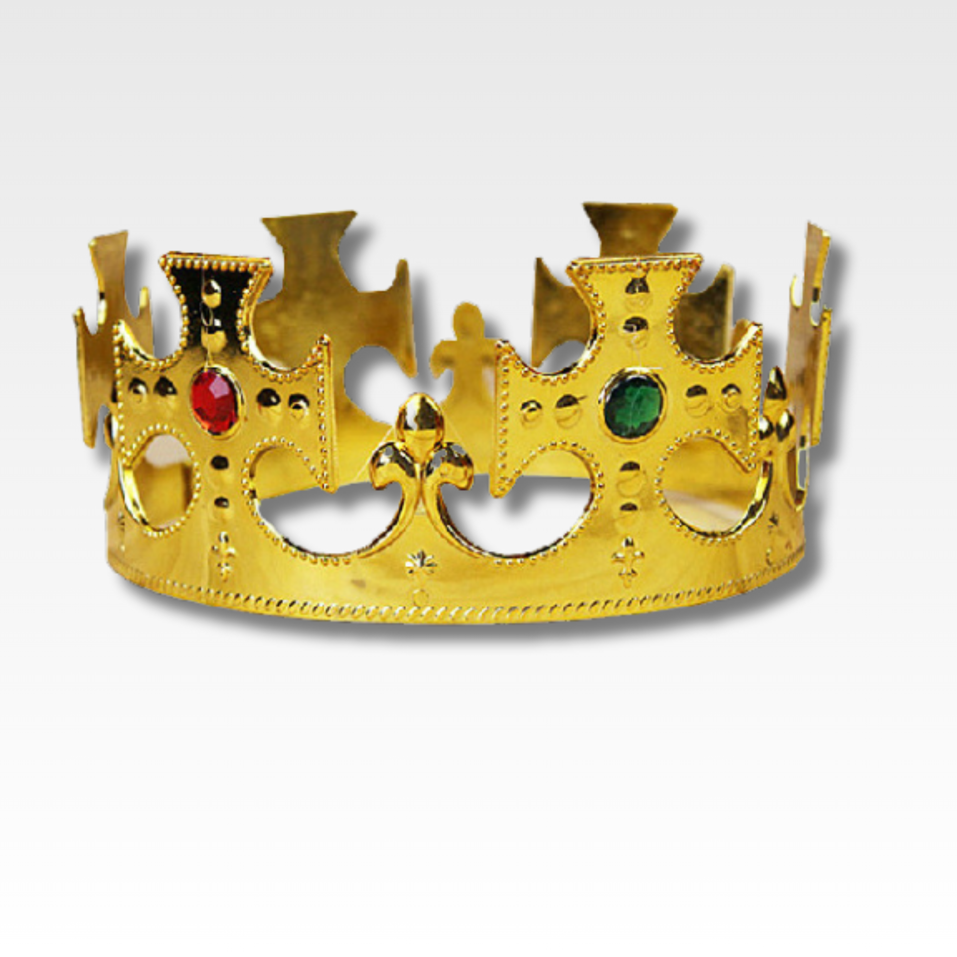 Luce como toda una realeza con esta Corona de Rey en acabado dorado o plateado, decorada con detalles de cruces y piedras de colores que aportan un toque elegante y majestuoso. Es ligera, cómoda y resistente, ideal para completar disfraces, presentaciones teatrales, fiestas temáticas, Halloween o eventos especiales.