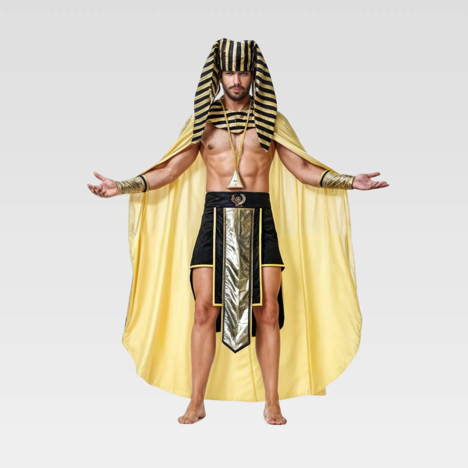 ¡Transforma tu presencia y conquista el evento con nuestro majestuoso disfraz de faraón para hombre! Este traje elegante y auténtico te transportará al esplendor del Antiguo Egipto, permitiéndote canalizar el poder y la grandeza de los líderes más venerados de la historia.