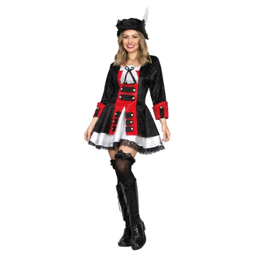 Navega los siete mares con estilo y actitud! Este disfraz de Pirata Corsario combina la elegancia y el toque rebelde del clásico look pirata. Incluye un vestido negro con detalles rojos y dorados, inspirado en los capitanes corsarios más temidos, y encajes blancos que añaden un aire femenino y sofisticado.