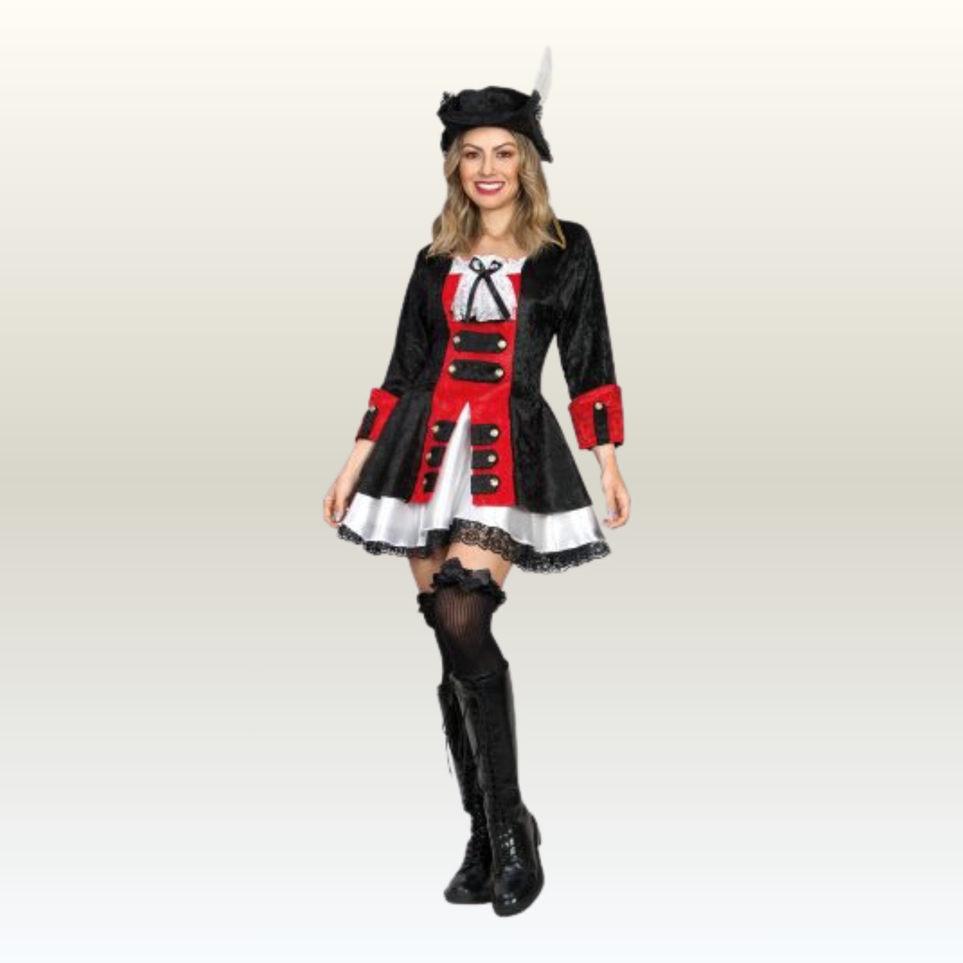 ¡Navega los siete yeguas con estilo y actitud! Este disfraz de Pirata Corsario combina la elegancia y el toque rebelde del clásico look pirata. Incluye un vestido negro con detalles rojos y dorados, inspirado en los capitanes corsarios más temidos, y encajes blancos que añaden un aire femenino y cómodo.