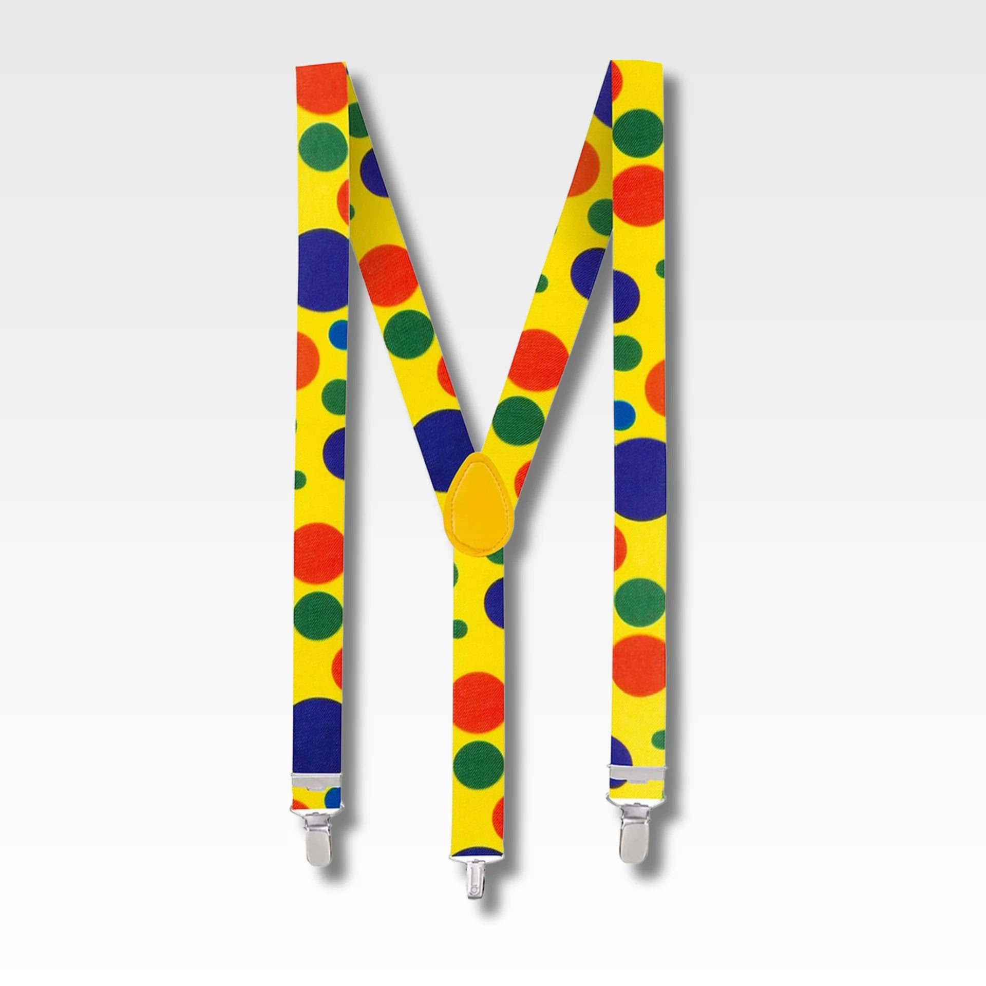 Dale un toque divertido y auténtico a tu disfraz con estas Tirantas de Payaso Multicolor, diseñadas con fondo amarillo y grandes círculos de colores. Son el complemento ideal para disfraces de payaso, artistas de circo, presentaciones teatrales, shows infantiles, Halloween o carnaval..