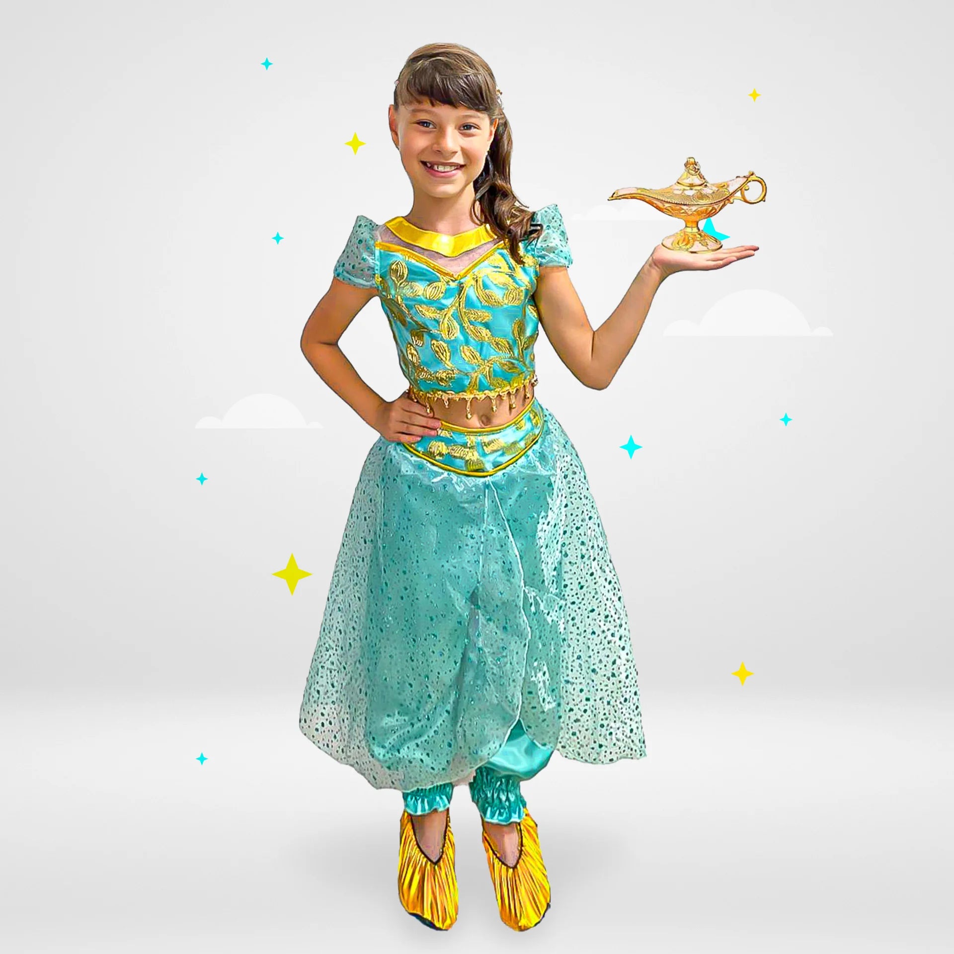 ¡Déjate llevar por la magia y el encanto del oriente con nuestro hermoso disfraz de Princesa Jazmín! Inspirado en la valiente y aventurera princesa de Agrabah, este conjunto es perfecto para que cualquier niña se sienta como la protagonista de su propio cuento de hadas.